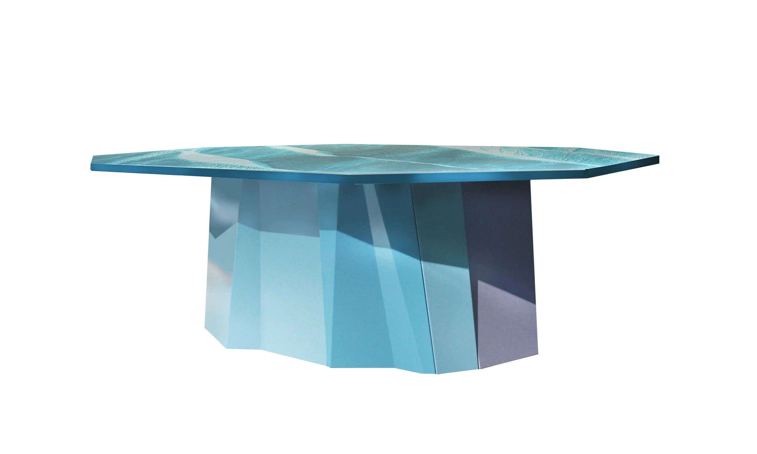 Each piece is a fragment of that crystalline kingdom. Layered surfaces in polar blue hues capture light, creating transparent depths that hold millenni a — sculptural furnishings that dialogue with space like drifting icebergs.