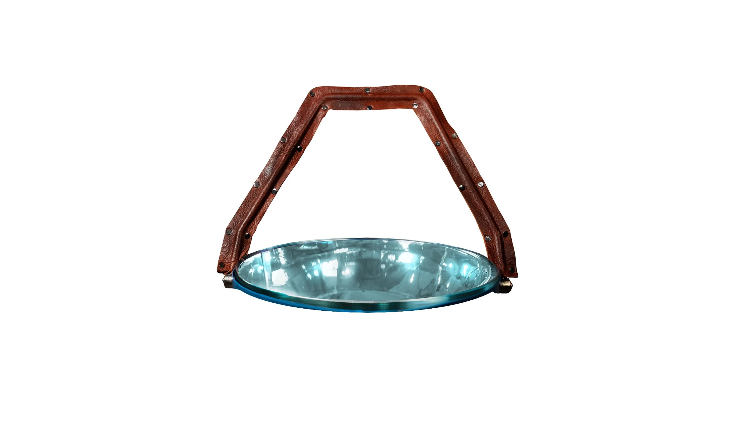 Materials: handcrafted leather, extra-clear monolithic crystal, curved metal, super mirror stainless steel — 55 x 45 cm Studio RG
