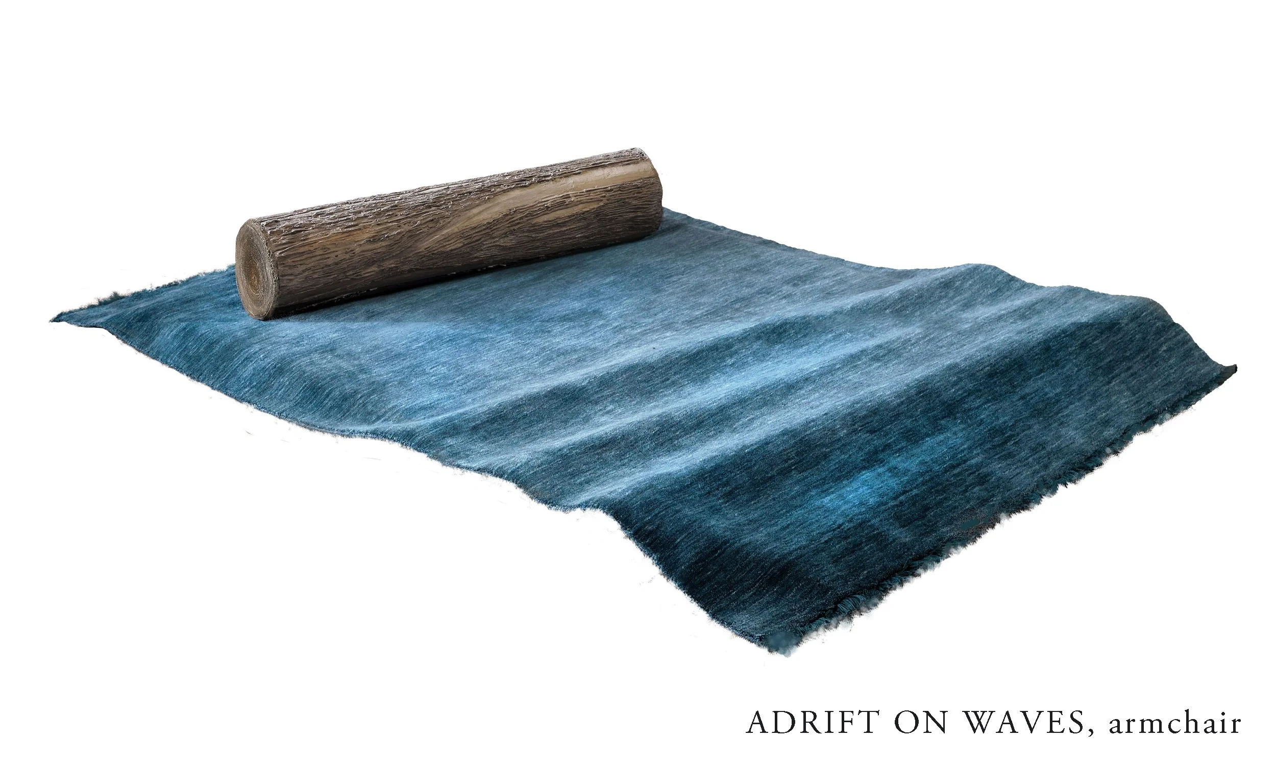 4.Adrift on Waves — A floor installation that invites you to stop, lie down, close your eyes and let go. The sculptural log in silicone resin — a tribute to Piero Gilardi — becomes cushion, support, a tangible presence of nature entering the domestic space. The soft blue carpet, shading from azure to deep indigo, is a liquid surface on which to float between worlds. Like a tarot card, it opens itself to multiple interpretations: nest for rest, island for reflection, threshold to inner landscapes. A place to lose yourself in order to find yourself, where the boundary between art and everyday life dissolves in the simplicity of a gesture: lying down, breathing, floating.