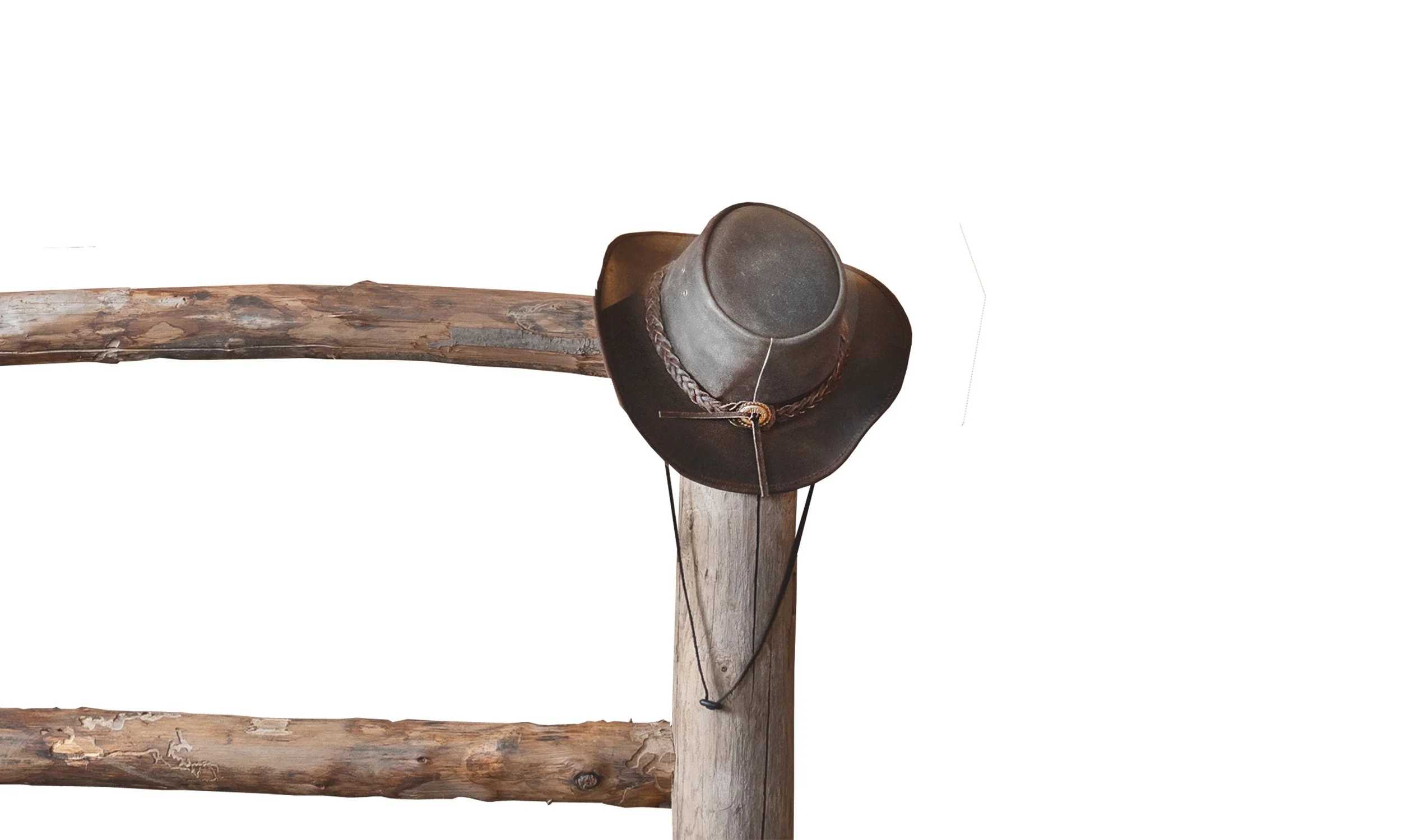 Materials: ancient oak wood, cement-based resins, sand, shrubs, original vintage American cowboy hat in leather — 220 x 60 x 100 cm Studio RG