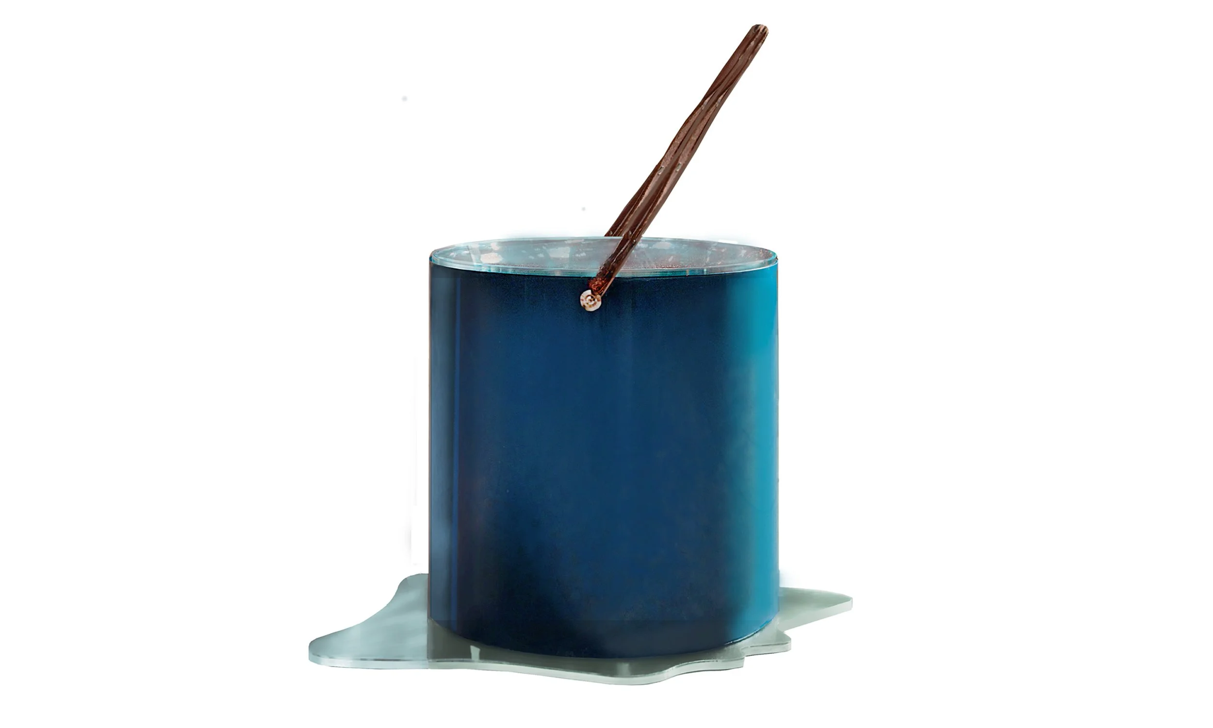 2.Almuerzo — A decorator's paint bucket becomes a throne. A construction site container transforms into a regal seat. Almuerzo — "lunch" in Spanish — is a monument to that suspended moment when artisans stop, sit on whatever is at hand, and recover their strength. The industrial container is embellished with an Easy Rider-style studded leather backrest — rebellion and craft fused together. The mirrored interior reflects whoever sits: the soul of the construction site, tired but dignified faces, breaks stolen from time, conviviality. At the base, a spill of mirrored silver flows like overturned paint — the permanent imprint of work, the trace that remains when everything else is consumed. The worker's throne. The painter's chair.